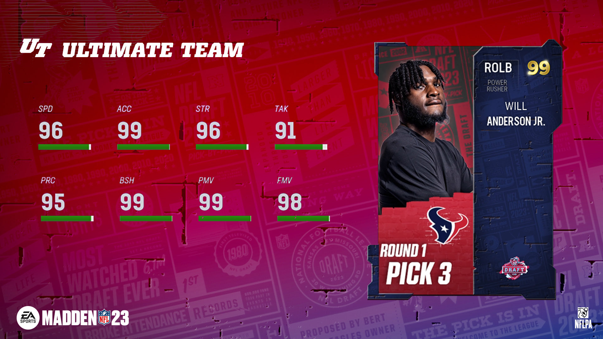 - 99 OVR 3rd Overall Pick Will Anderson Jr - Exchange 3x 97 OVR NFL Draft Past Players and 1x 95 OVR Past Draft Player to receive 1x 99 OVR 3rd Overall Pick Will Anderson Jr, and a Fantasy Pack containing your choice of 3x 97 OVR NFL Draft Past Hero Players (BND).