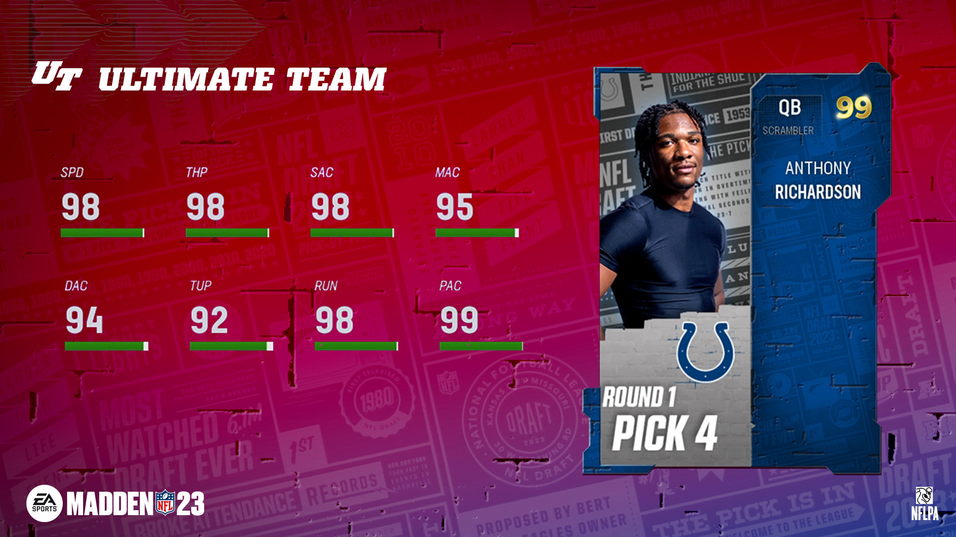 - 99 OVR 4th Overall Pick Anthony Richardson - Exchange 3x 97 OVR NFL Draft Past Players and 1x 95 OVR Past Draft Player to receive 1x 99 OVR 4th Overall Pick Anthony Richardson, and a Fantasy Pack containing your choice of 3x 97 OVR NFL Draft Past Hero Players (BND).