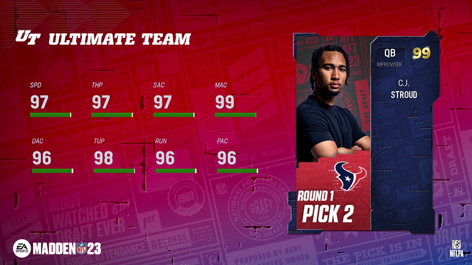 - 99 OVR 2nd Overall Pick C.J. Stroud - Exchange 3x 97 OVR NFL Draft Past Players and 1x 95 OVR Past Draft Player to receive 1x 99 OVR 2nd Overall Pick C.J. Stroud, and a Fantasy Pack containing your choice of 3x 97 OVR NFL Draft Past Hero Players (BND).