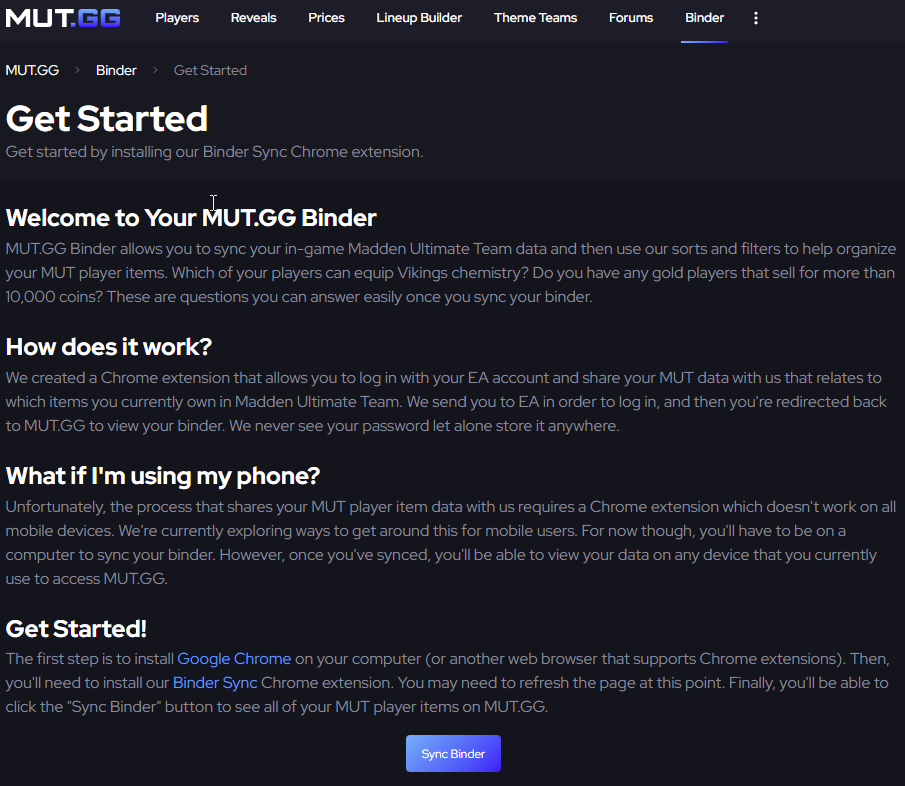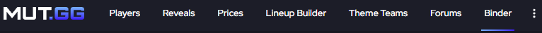 The first method requires you to be on a computer/laptop with Google Chrome and have the MUT.GG Binder Sync Extension installed. If you’ve never synced your binder before, click ‘Binder’ on the top navigation bar.