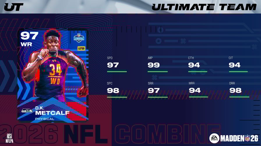 NFL Combine Part 1.5 dropped today, including 97 OVR LTDs D.K. Metcalf and Harrison Smith, and 96 OVR Champions Antonio Cromartie, Tristan Wirfs, and Von Miller. LTDs Metcalf and Smith will be in packs until 10am ET on Saturday, March 7th. Check out the new player items with their NFL Combine X-Factors and custom abilities in our database below: