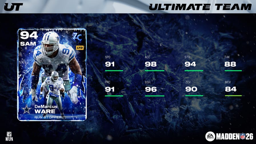 Six new Zero Chill LTDs and Champions dropped in MUT today with Part 7 of this year's Zero Chill program. 94 OVR LTDs DeMarcus Lawrence and Jake Long can be found in packs until 1pm ET on January 7th. The new 93 OVR Champions include Courtland Sutton, Joey Bosa, Roger McCreary, and QB Taysom Hill, who has secondary position TE, baked-on Ironman (0 AP), baked-on Indoor Baller (0 AP), and frozen ability buckets for both positions! Check out the new players below: