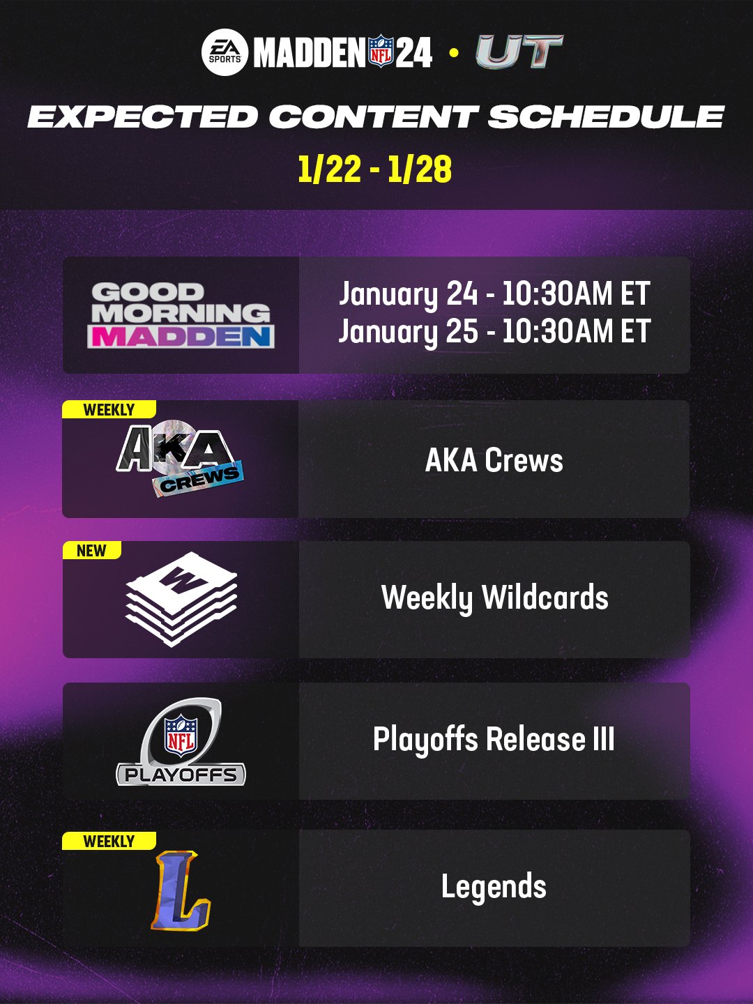 Expected content for this week\*\*ALWAYS SUBJECT TO CHANGE BY EA\*\*