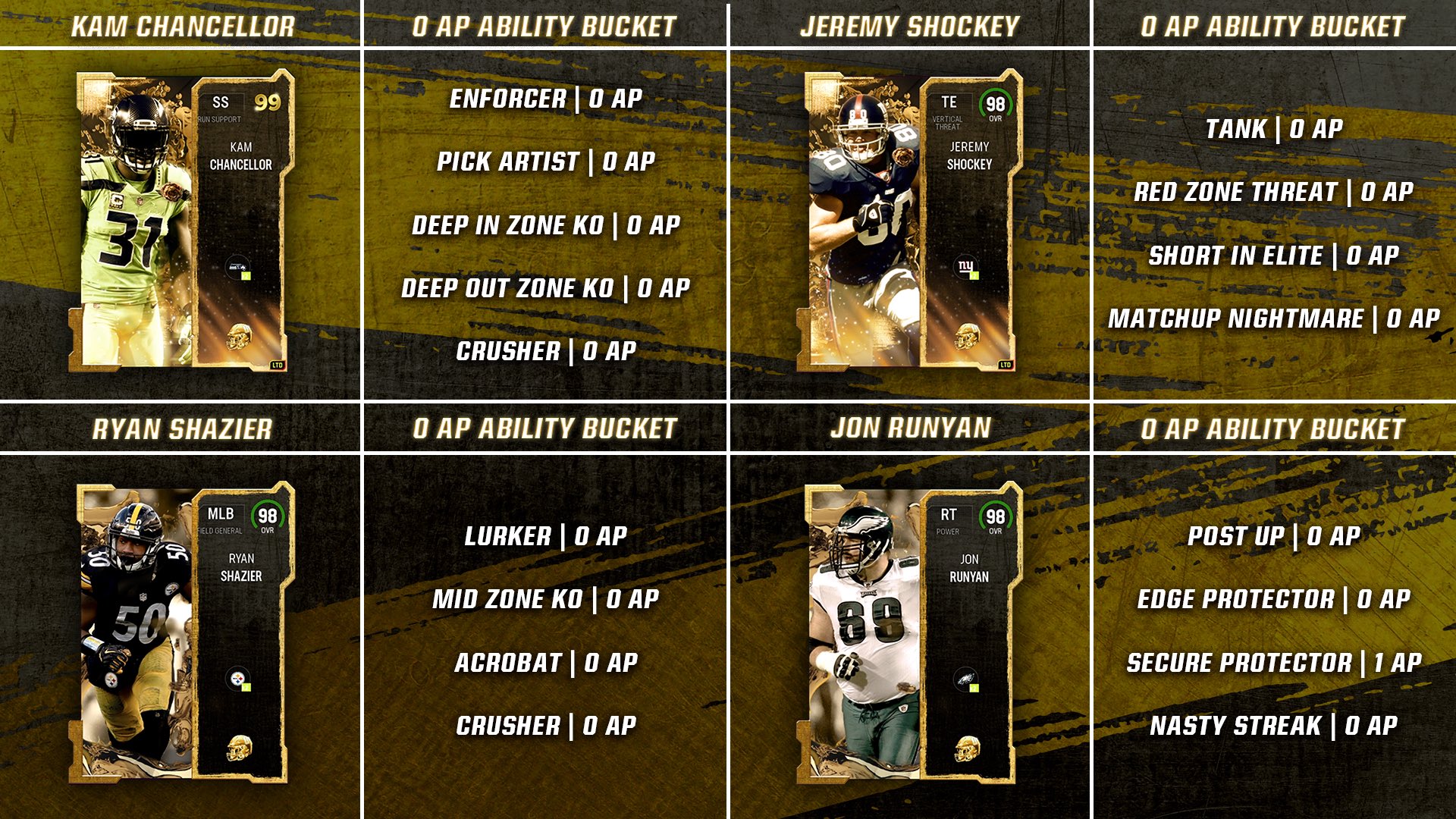 [ULTIMATE LEGENDS STATS & PICS] LTD'S:KAM CHANCELLOR & J.SHOCKEY /SETS:R.SHAZIER & J.RUNYAN